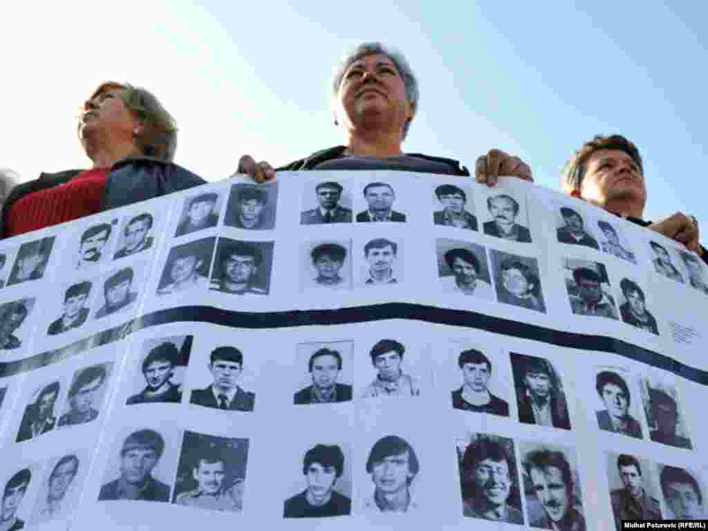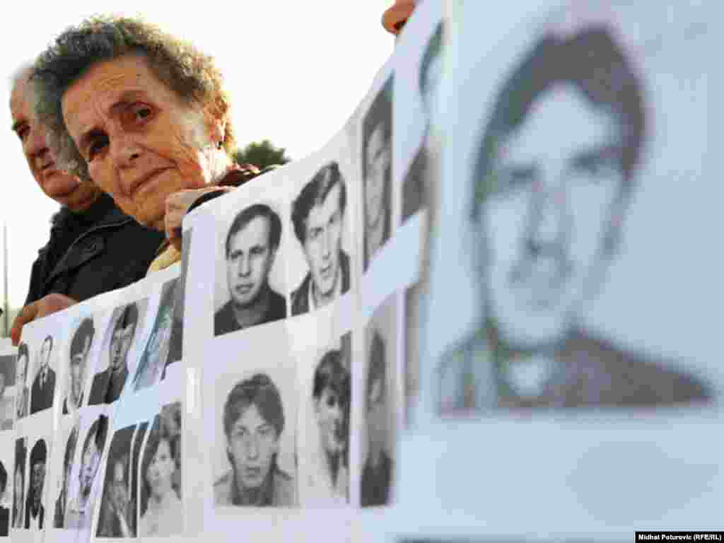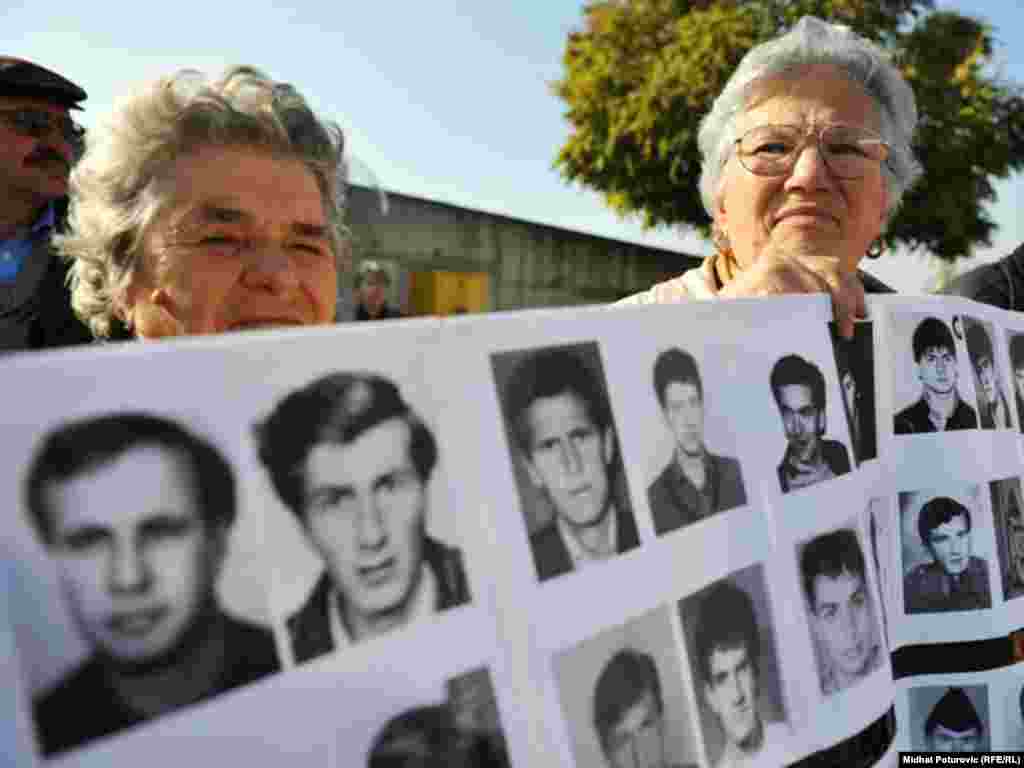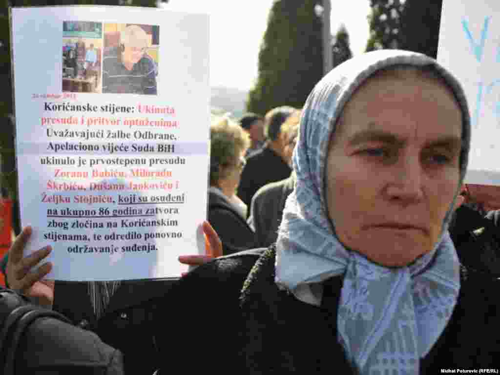 Predstavnici udruženja koja okupljaju porodice nestalih sastali su se pred Sudom BiH kako bi iskazali nezadovoljstvo odlukom Apelacionog vijeća da se Zoranu Babiću, Miloradu Škrbiću i Željku Stojniću, kojima se sudi za zločin počinjen na Korićanskim stijenama, ukine prvostepena presuda. 2. novembar 2011. (Autor: Zvjezdan Živković)
