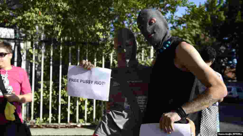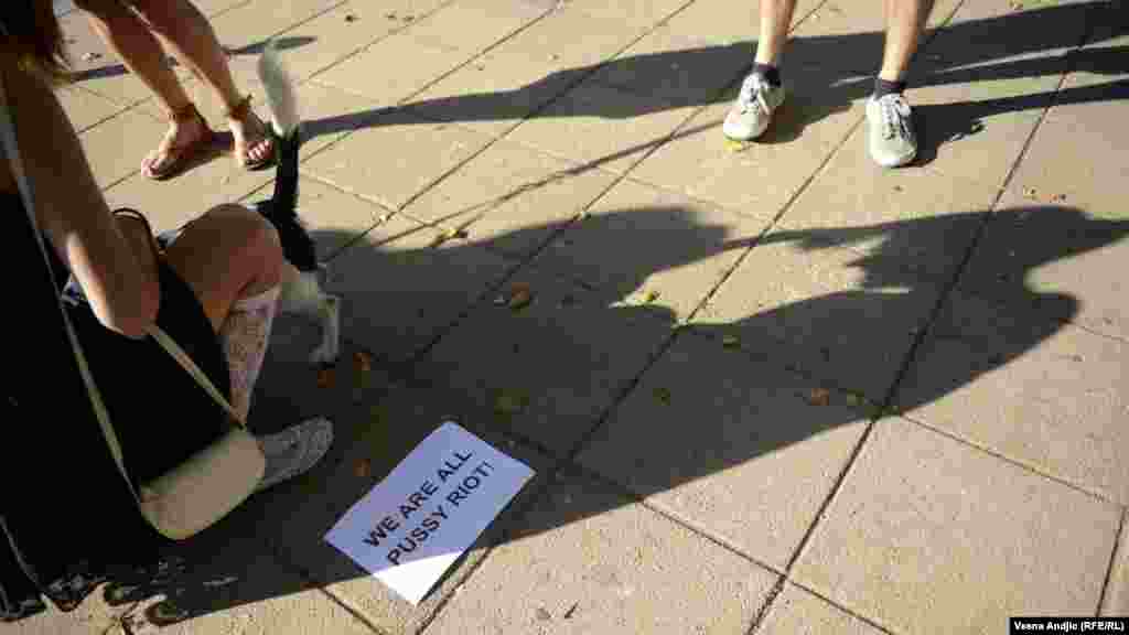 Nekoliko desetina ljudi u Beogradu pridružilo se svetskim prestonicama u protestima podrške osuđenim članicama ruskog punk benda Pussy Riot. Iako je skup prethodno otkazan zbog pretnji ultradesničarskih organizacija, minut ćutanja za „mrtvu slobodu govora u Rusiji i Srbiji“, ipak je održan u prisustvu velikog broja policajaca. 17.8.2012. RSE foto/Vesna Anđić