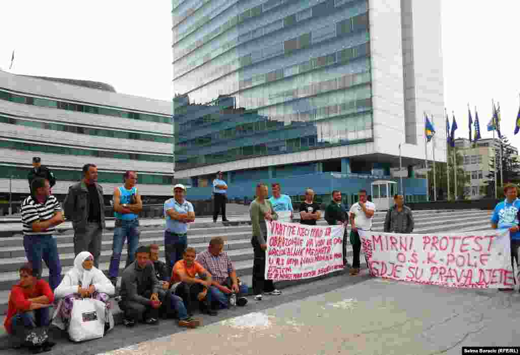 Četrdesetak roditelja djece bošnjačke nacionalnosti iz Konjević Polja okupilo se ispred Parlamenta BiH i Ureda visokog predstavnika u Sarajevu. Traže uvođenje nacionalne grupe predmeta i odvijanje nastave u osnovnim školama na službenim jezicima konstitutivnih naroda u BiH. 16. septembra 2013. Foto: Selma Boračić