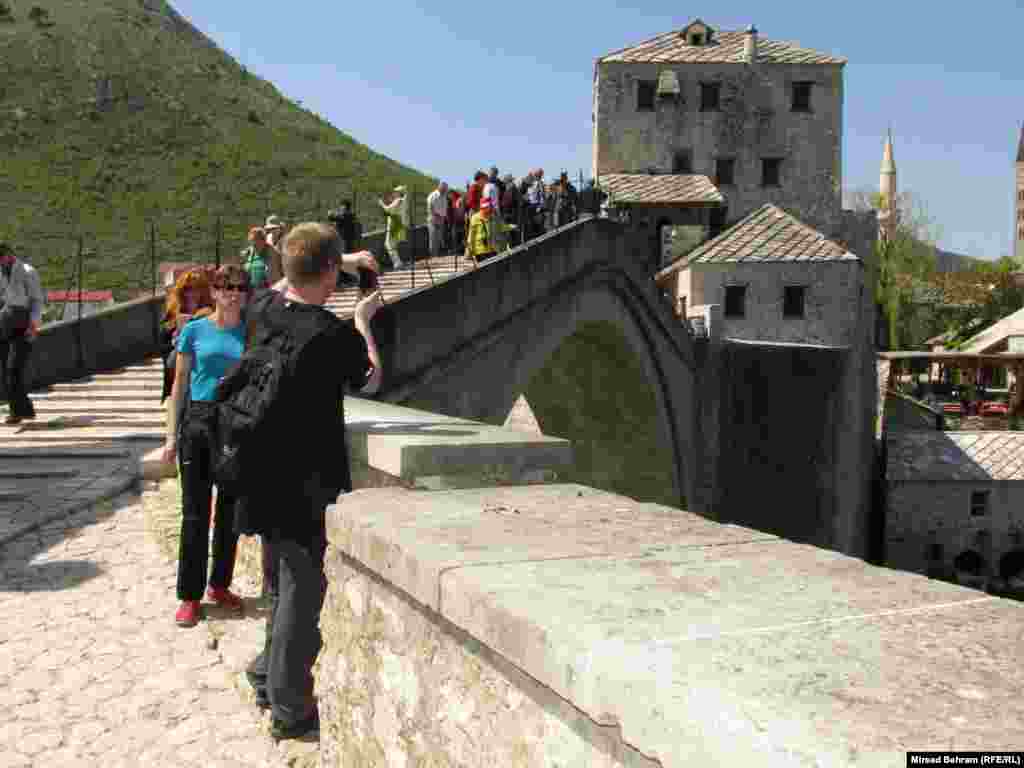 Prve grupe stranih i domaćih turista već se mogu vidjeti u mostarskom Starom gradu, mada ljudi koji žive od prodaje gostima kažu da je broj onih koji pohode Stari most i staro gradsko jezgro Mostara manji nego prethodnih godina. FOTO: Mirsad Behram
