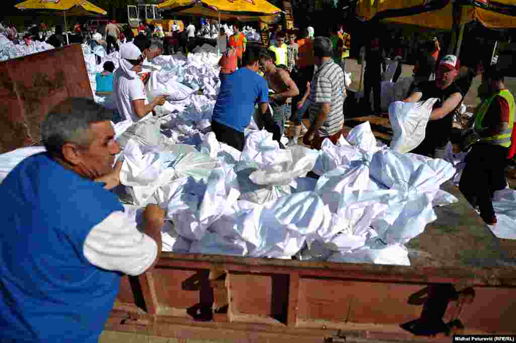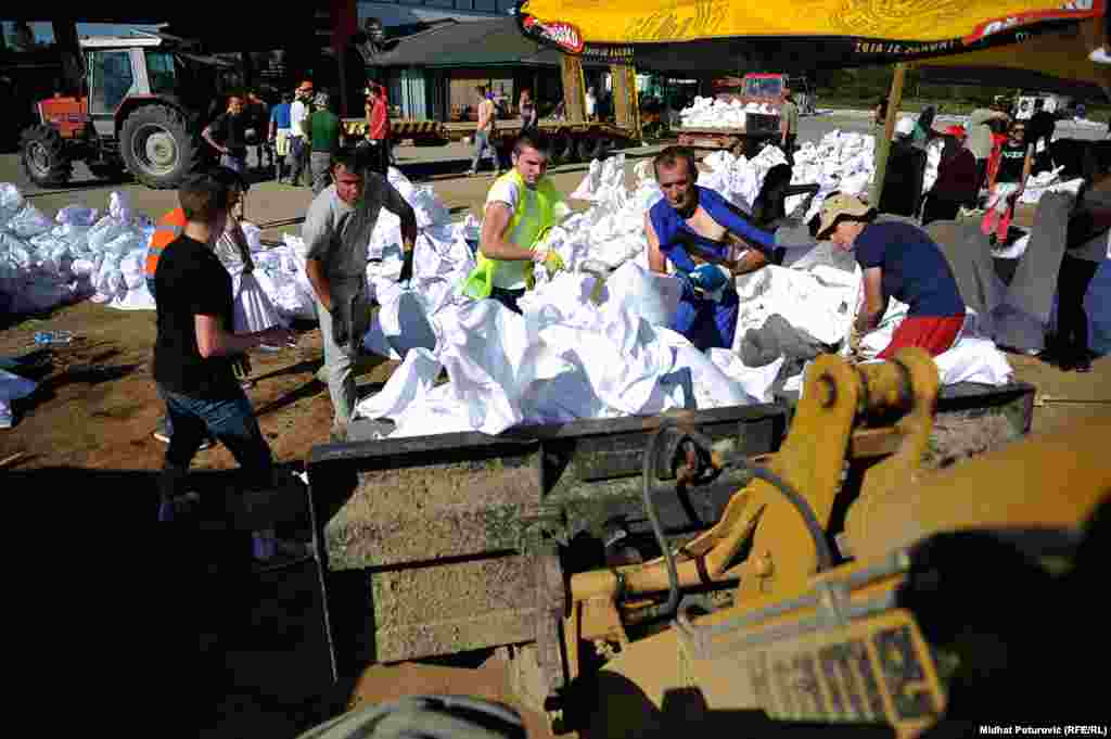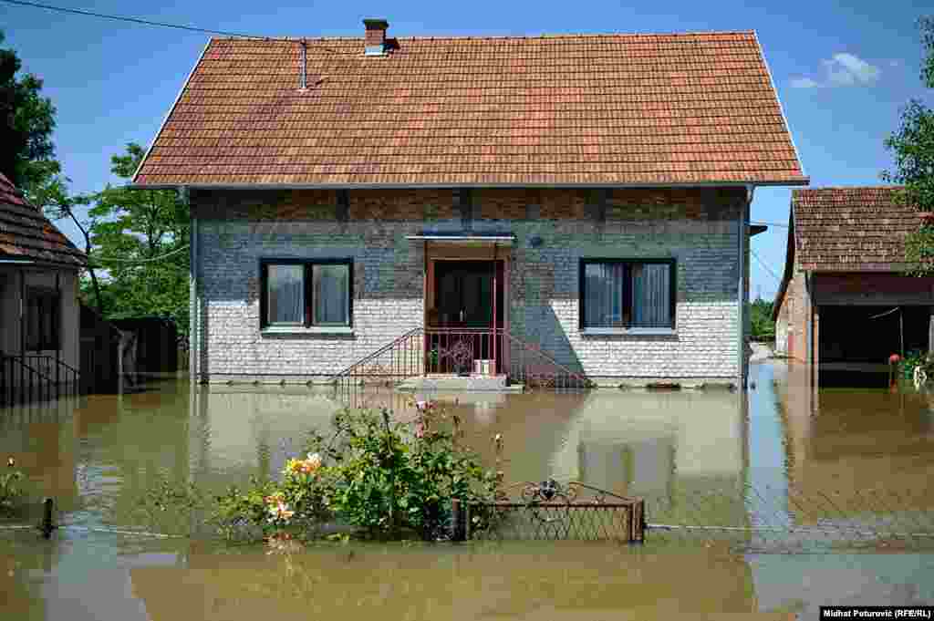 Selo Lepnica u okolini Orašja potpuno je poplavilo. Stanovnici su evakuisani, a čamcima, u grupama obilaze napuštene domove i hrane preživjelu stoku. U centru grada, u Srednjoškolskom centru, ali i Osnovnoj školi u Orašju organizovani su prihvatni centri za evakuisane mještane. FOTO: Midhat Poturović