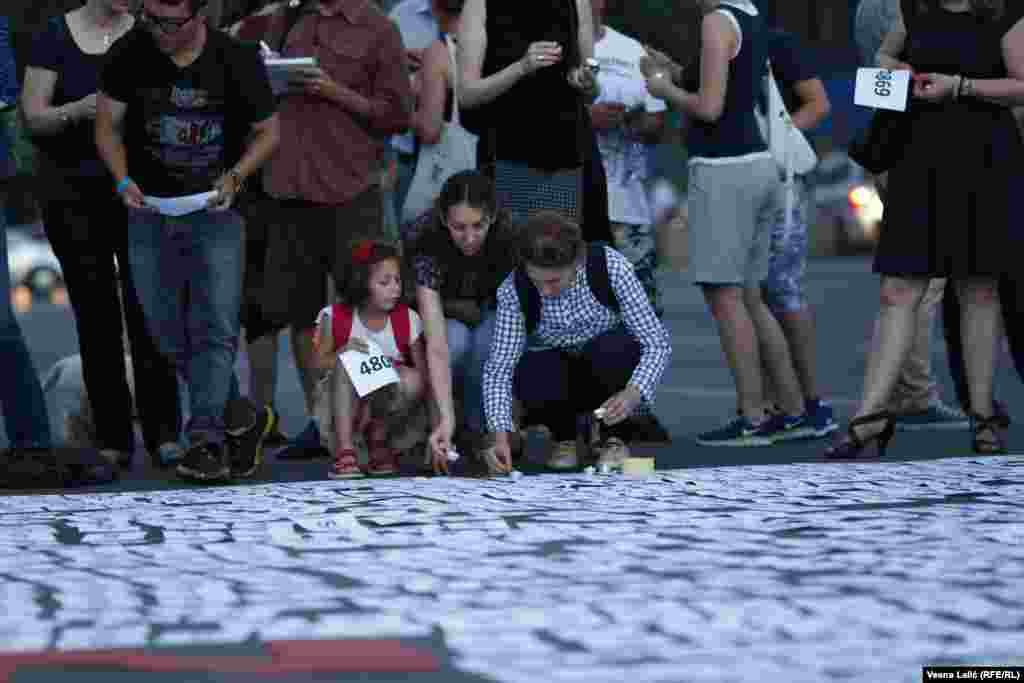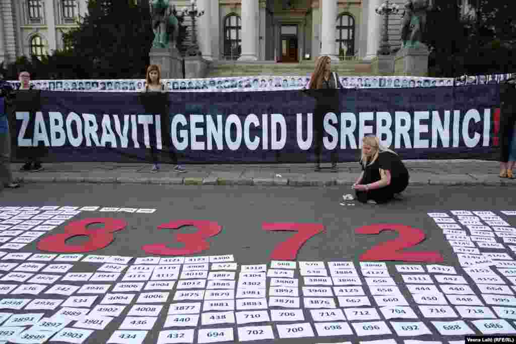 Aktivisti nevladinih organizacija i građani Beograda palili su sveće i ređali 8372 broja ispred Skupštine Srbije, u znak sećanja na genocid u Srebrenici. Ovo je drugi put da se na ovaj način obeležava godišnjica genocida u tom bosanskom mestu, kada su snage Vojske Republike Srpske ubile preko osam hiljada muškaraca i dečaka bošnjačke nacionalnosti. (foto: Vesna Lalić)