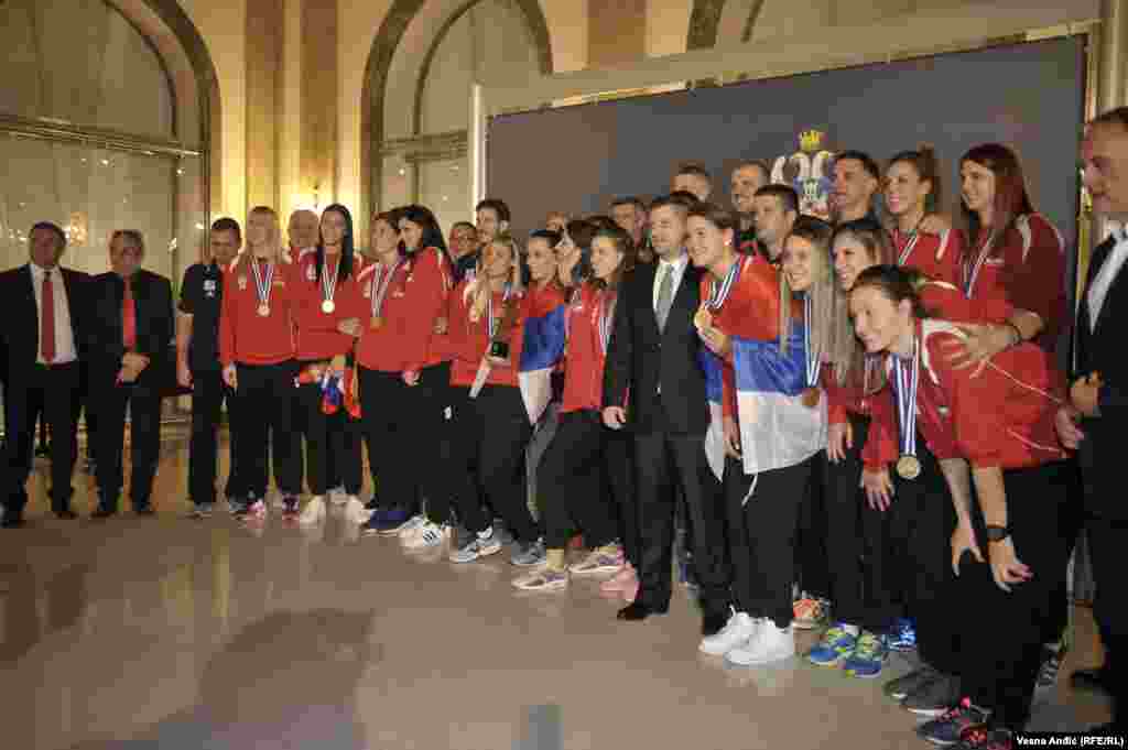 Nekoliko hiljada ljudi je na platou ispred Starog dvora u Beogradu dočekalo žensku odbojkašku reprezentaciju Srbije koja je osvojila Evropsko prvenstvo, pošto je u finalu u Bakuu pobedila Holandiju sa 3:1 u setovima.