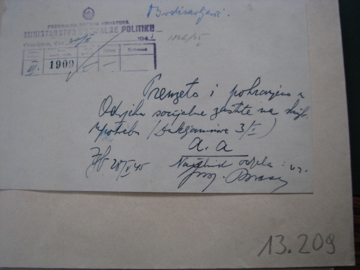 kako je dogovoreno i tako svima pokazati da se strogo držim propisa koje je izdao poglavnik. Nakon Ministarstva udružbe odlazim u ustaški Židovski odsjek Ustaške policije i pokušati dobiti dozvolu za rad. Predstojnik me primio