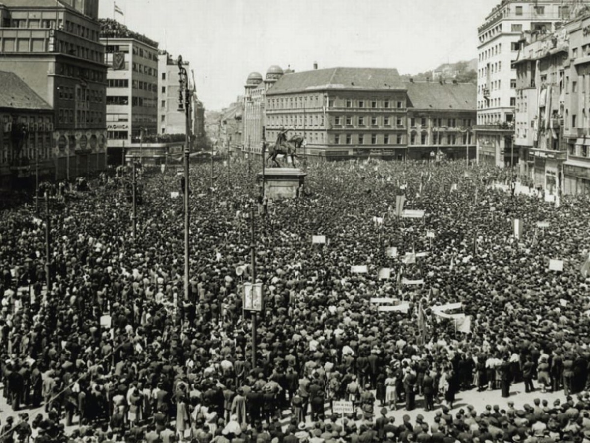 Nadbiskup Alojz Stepinac snimljen nakon oslobodjenja Zagreba, 1945. godine, na tribini pored partijskog funkcionera Vladimira Bakaraića i neimenovanog ruskog geneala