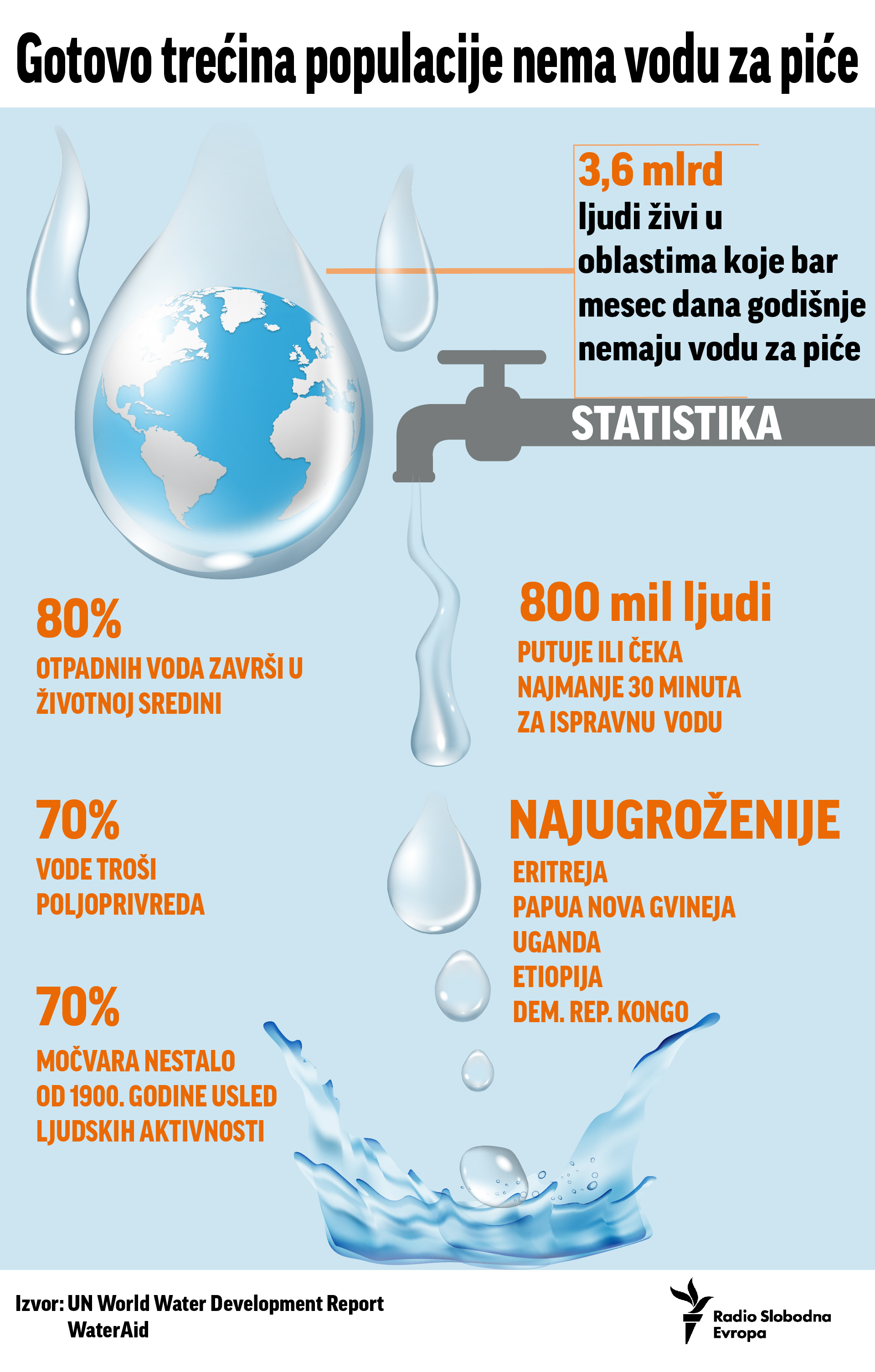Više od dve milijarde ljudi u svetu nema pristup vodi bezbednoj za piće, navodi se u najnovijem izveštaju UN. Uz postojeći tempo rasta svetske populacije, potrebe za vodom do 2050. godine biće veće za čak jednu trećinu od današnjih, upozoravaju stručnjaci i dodaju da se bliži dan kada će potrebe za vodom premašiti zalihe.