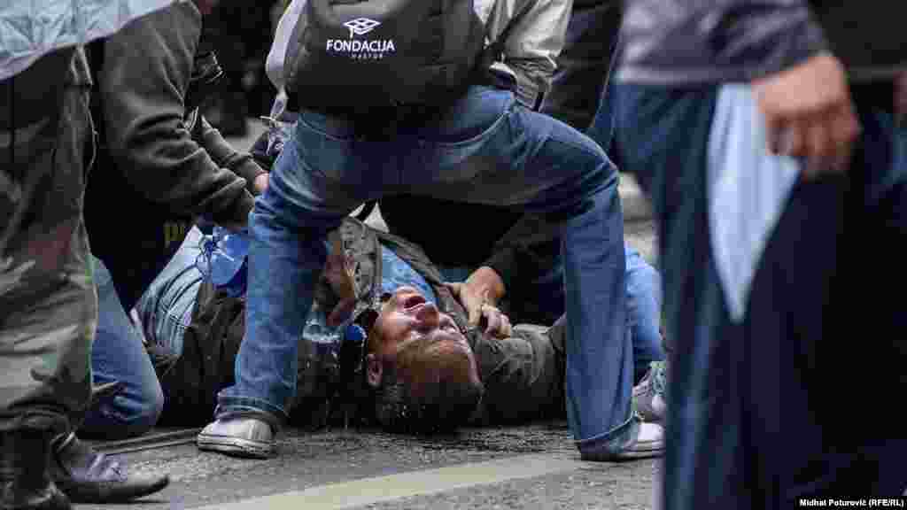 U ulici Obali Kulina bana došlo je do prvog incidenta između boraca i pripadnika police, da bi potom izbilo nekoliko fizičkih obračuna. Upotrijebljen je i suzavac, a na lice mjesta upućena je i Hitna pomoć.