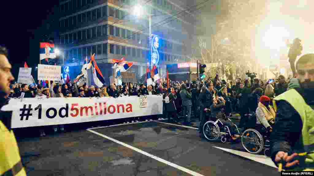 Građani Beograda okupili su se po četvrti put na protestu "Stop krvavim košuljama" ili "1 od 5 miliona", slogan nastao kao reakcija na izjavu predsednika Srbije Aleksandra Vučića da neće ispuniti nijedan zahtev organizatora protesta.
