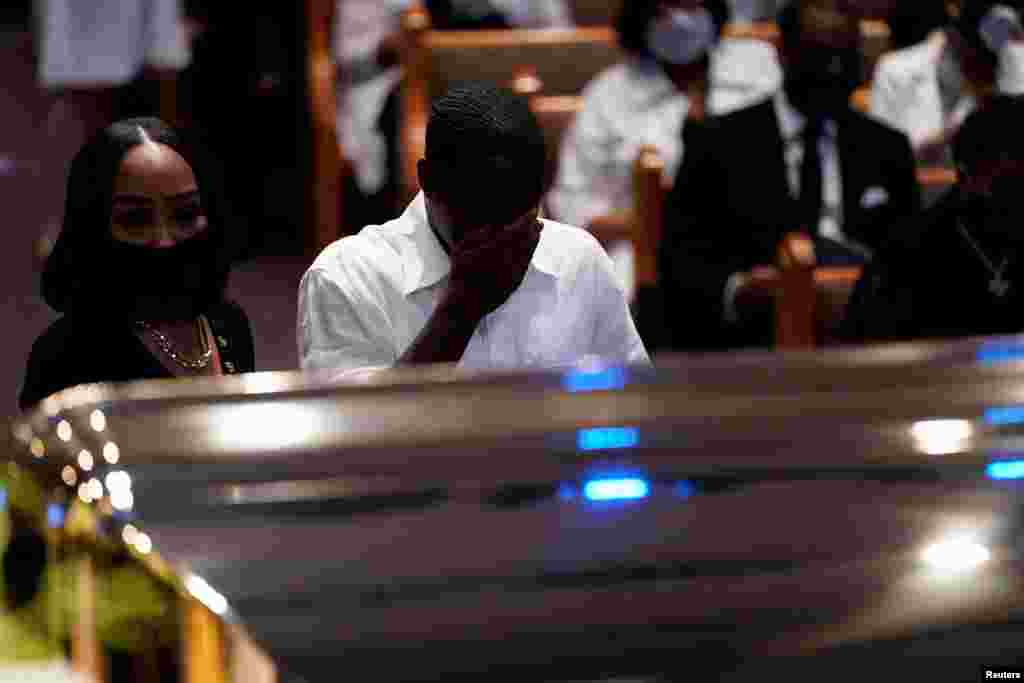 Ožalošćeni obučeni u crno, neki u majicama s porukom "Ne mogu disati" (I can't breathe), riječi koje je Afroamerikanac George Floyd izgovorio dok mu je policajac držao koljeno na vratu, okupili su se 9. juna u crkvi u Houstonu, Teksas, na sahrani Floyda, čija je smrt u policijskom pritvoru 25. maja podstakla na proteste protiv rasizma širom svijeta.