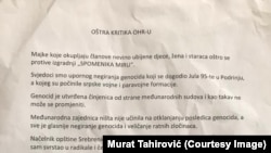 Udruženja žrtava i svjedoka genocida iz Srebrenice uputilo je dopis Uredu visokog predstavnika u BiH (OHR) u kojem ističe kako se oštro protivi izgradnji "Spomenika mira" u Srebrenici.