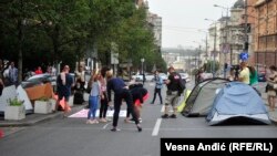 Desetak studenata okupljenih oko inicijative za smanjenje školarine za 30 odsto postavilo je šatore ispred Ministarstva prosvete Srbije u Nemanjinoj ulici u Beogradu, najavljujući blokadu tog ministarstva i saobraćaja na tri sata.