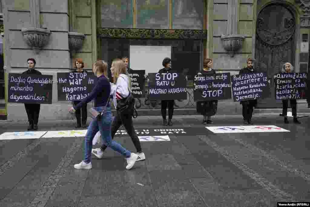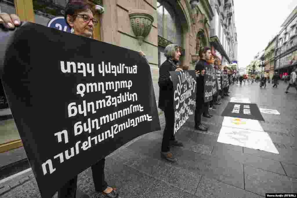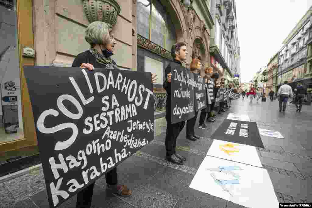 Nevladina, mirovna organizacija iz Srbije "Žene u crnom" održala je 7. oktobra u centru Beograda antiratni protest "Stop ratu u Nagorno-Karabahu". Aktivistkinje i aktivisti su stajali u tišini, obučeni u crninu, a njihov zahtev je hitna obustava borbenih dejstava i početak pregovora. "Žene u crnom" su istakle i da oštro osuđuju, kako su navele, "sramotni i kriminalni izvoz oružja (Jermeniji i Azerbejdžanu) proizvedenog u Srbiji, od čega najviše profitiraju izvoznici oružja". "Zahtevamo da se odmah obustavi izvoz oružja u Jermeniju i Azerbejdžan i da izvoznici oružja budu sankcionisani", navele su "Žene u crnom".