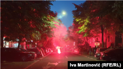 Okupljeni su, u jednom trenutku, bacili i upaljenu baklju preko kordona policije, koja se brzo ugasila.