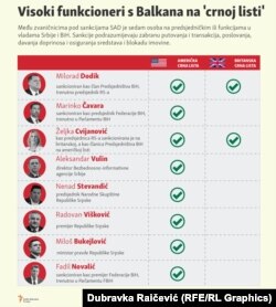 Članica Predsjedništva BiH, Željka Cvijanović, premijer RS Radovan Višković, predsjednik Narodne skupštine RS Nenad Stevandić i entitetski ministar pravde Miloš Bukejlović su sankcionisani zbog, kako se navodi, prijetnji Dejtonskom mirovnom sporazumu.