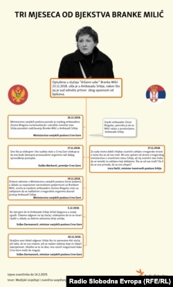 Da li je u proteklih mjesec i po bilo kontakata dvije strane i pokušaja da se postigne dogovor u slučaju Branke Milić, Radio Slobodna Evropa pokušala je da sazna od ministarstava pravde i vanjskih poslova, ali na naše elektronsko pismo na te dvije adrese nikakvog odgovora nije bilo. Na potezu je, kako je za RSE izjavio Jugoslav Krpović, advokat Branke Milić, ipak Podgorica, koja od Beograda može da zatraži izručenje Milićke.