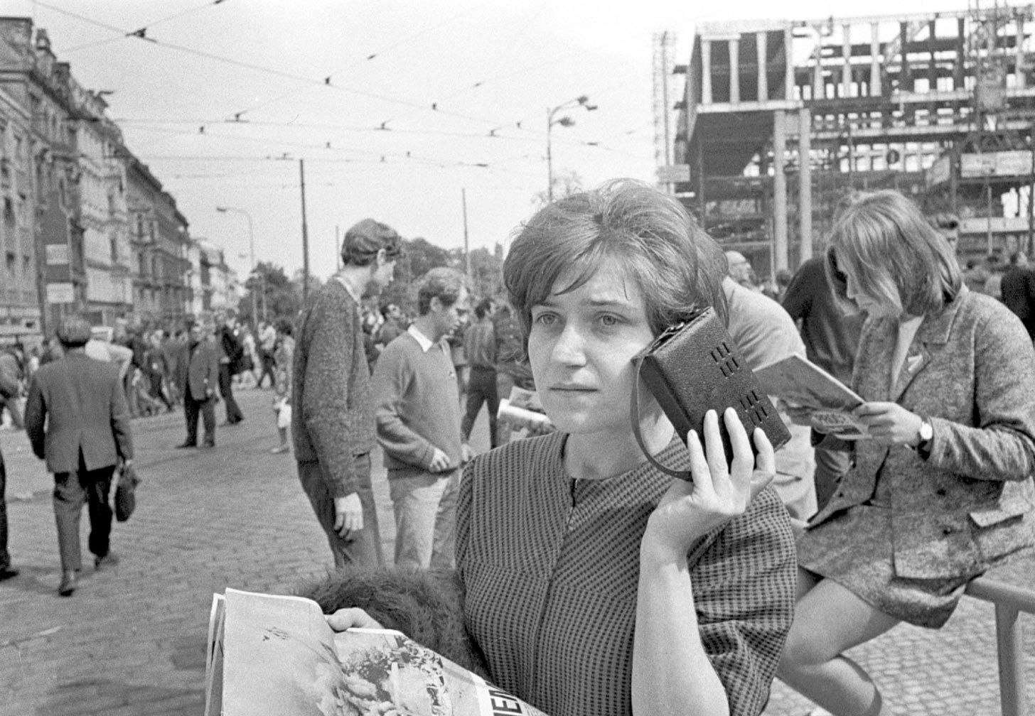 Žena na Vaclavskom trgu u Pragu sluša vijesti usred invazije i drži lokalne novine na kojima u naslovu piše "Zašto?" na češkom i ruskom. CTK