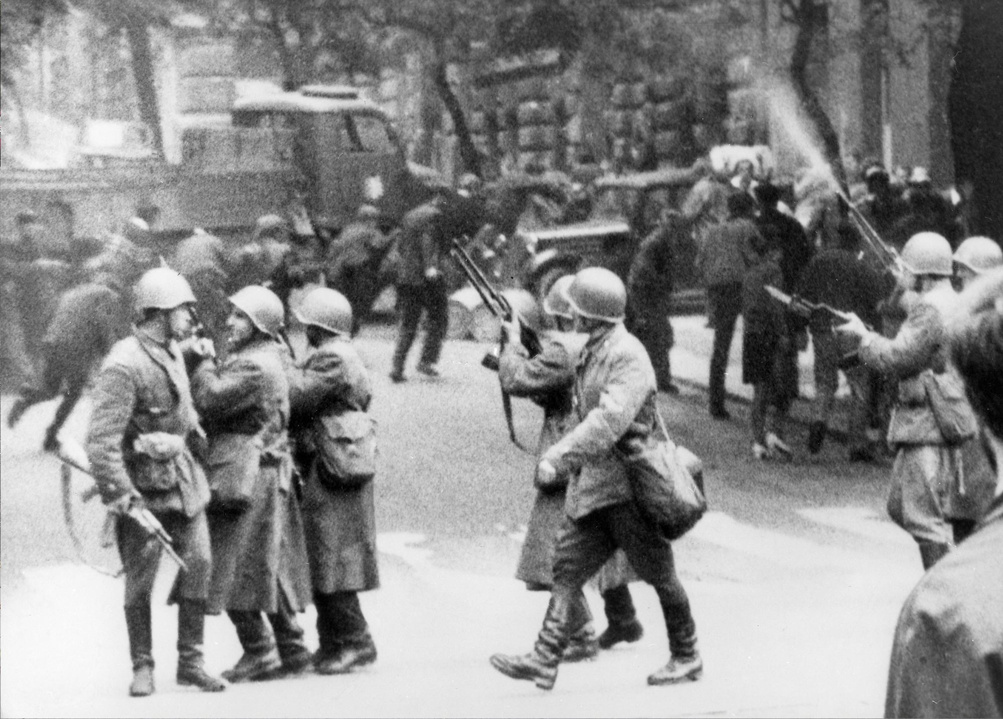 Trupe Varšavskog pakta pucaju u zrak dok patroliraju Pragom, tjerajući lokalno stanovništvo da traže zaklon. Tiedemann/Getty Images