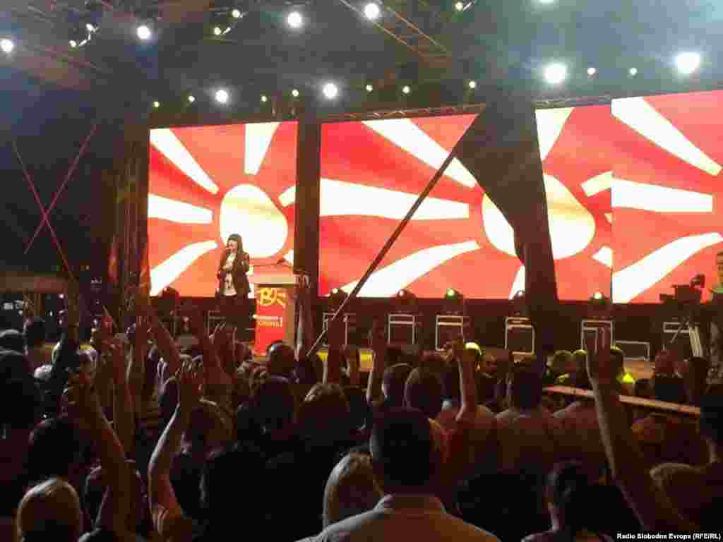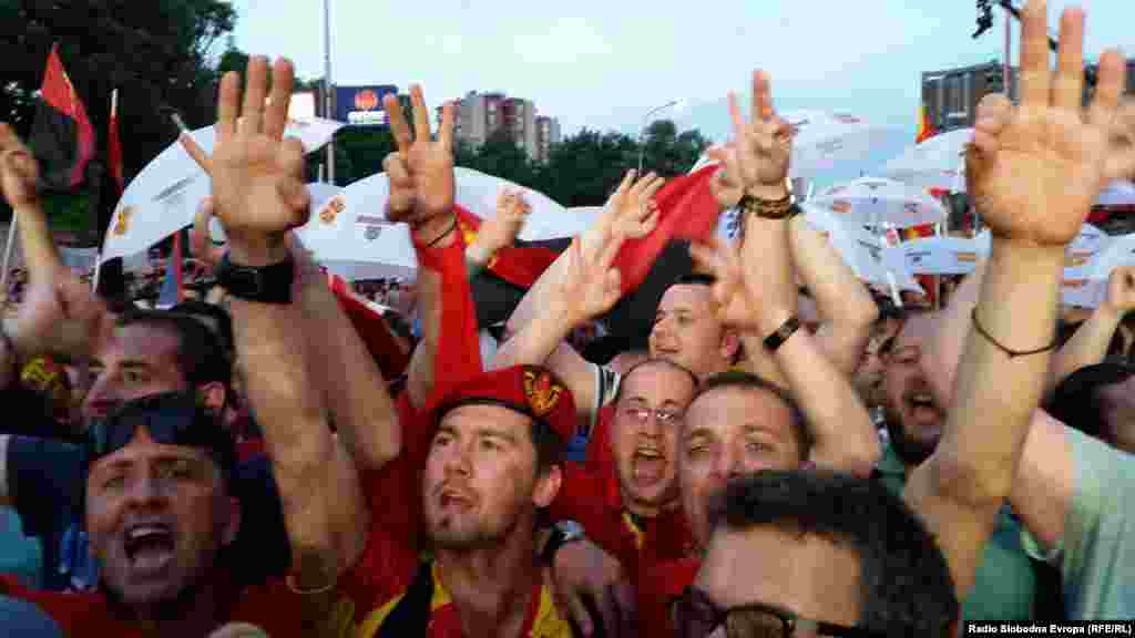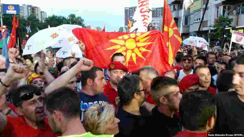 Miting u organizaciji vladajuće VMNO DPMNE zvanično je počeo u centru Skoplja nešto posle 20 časova. Kako prenose mediji, ispred zgrade Sobranja se okupilo oko 20.000 ljudi, u masi se vijore zastave Makedonije. Na jednom transparentu piše "No USA". Skup pod parolom "Snažna Makedonija" organizovala je vladajuća VMRO DPMNE i partije iz vladajuće koalicije. Centar grada je bio blokiran još od jutarnjih sati. FOTO: RSE/Makedonski servis