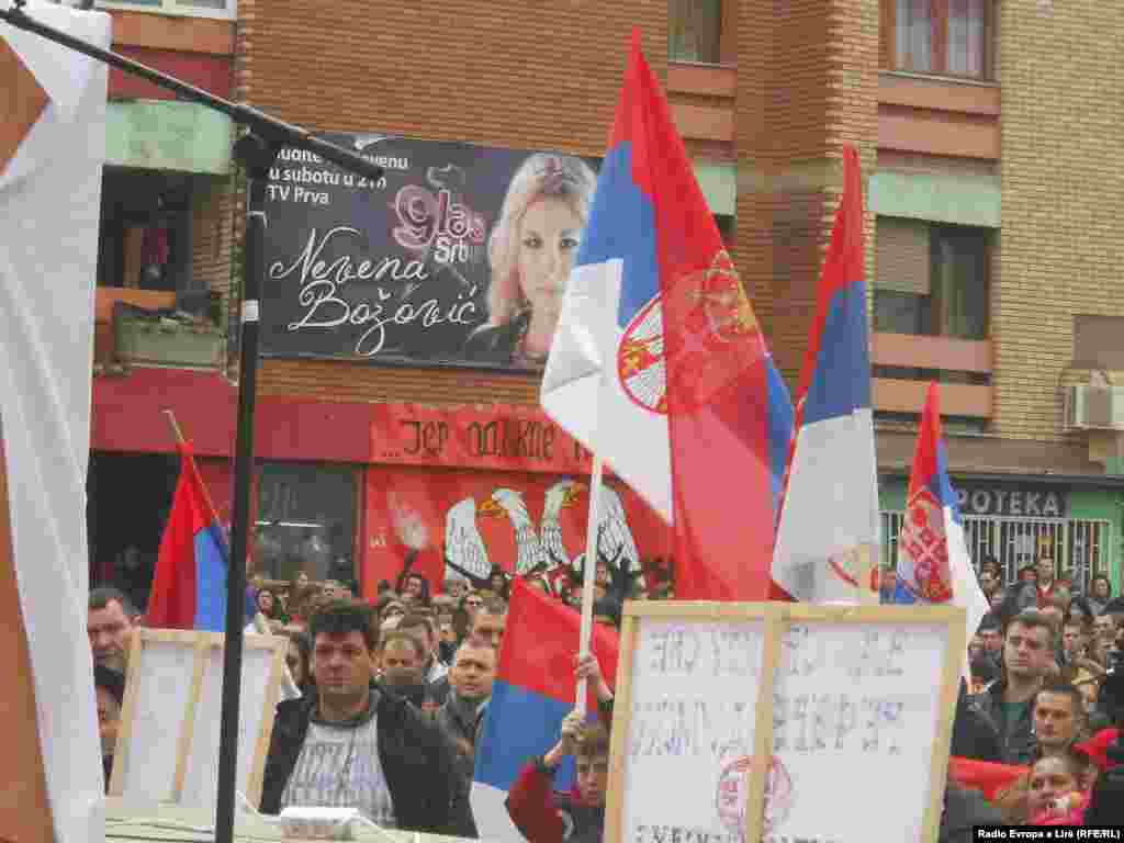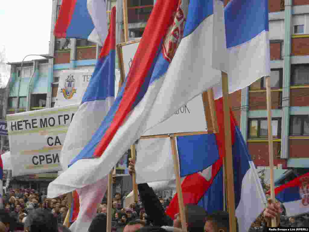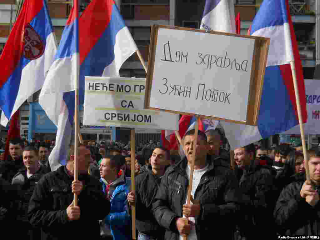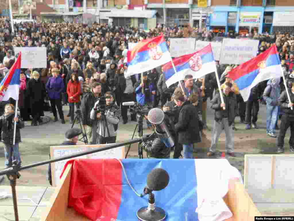 Više hiljada Srba okupilo se na glavnom gradskom trgu u severnoj Mitrovici u znak protesta zbog postignutih dogovora u Briselu. Oni su poručili da ne prihvataju nikakve carine i granice između Kosova i Srbije i integraciju u nezavisno Kosovo, 30. januar 2013.