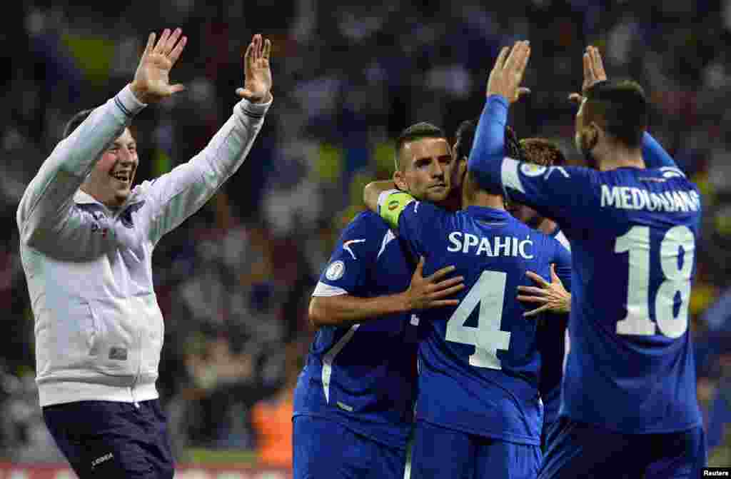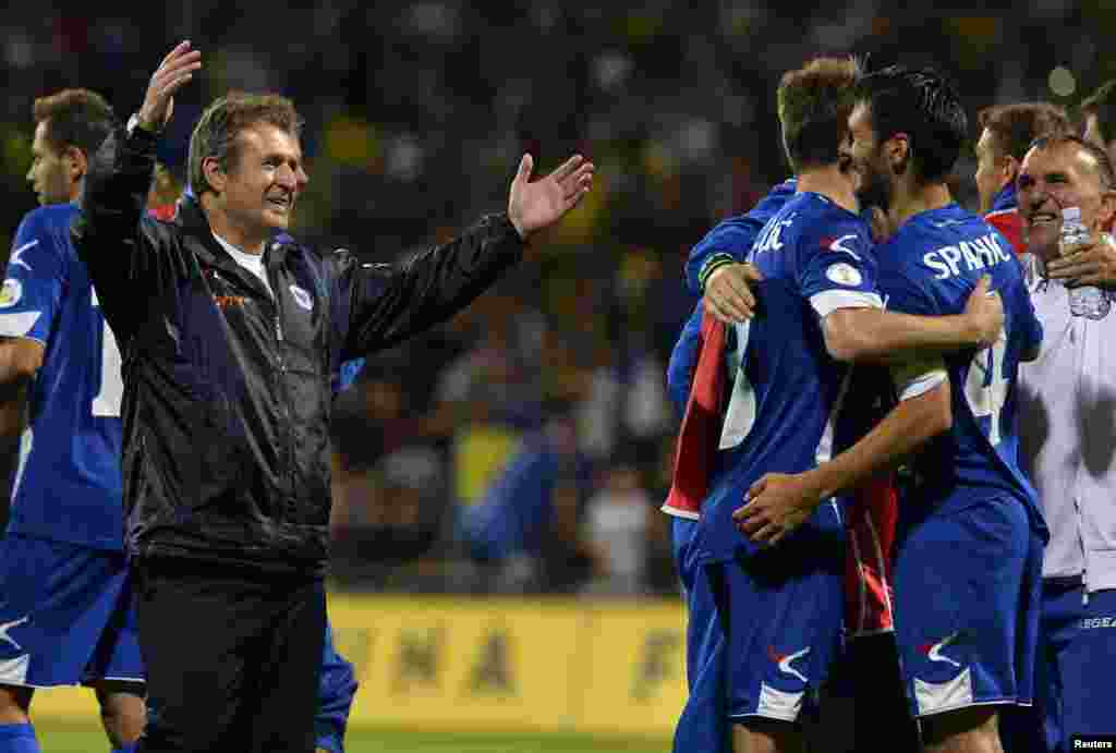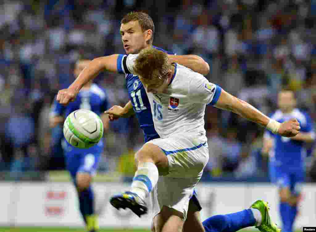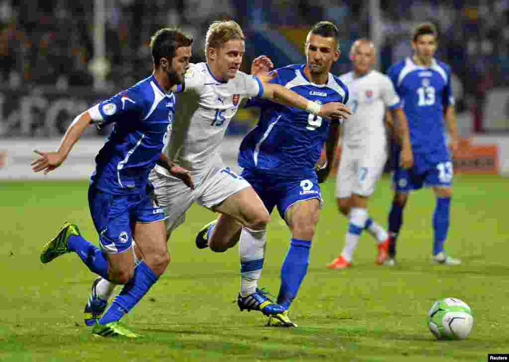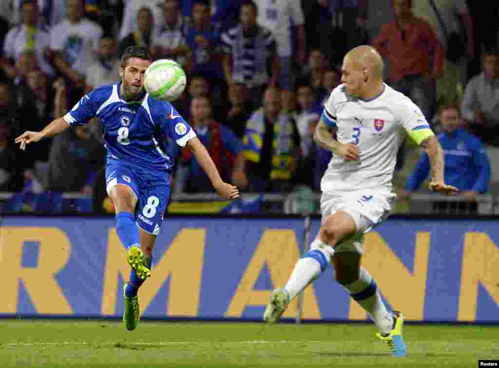 Nogometna reprezentacija Bosne i Hercegovine savladala je u Žilini selekciju Slovačke sa 2:1 i zadržala prvo mjesto u kvalifikacionoj grupi za Svjetsko prvenstvo. Gol za Slovačku postigao je Marek Hamšik, a za BiH Ermin Bičakčić i Izet Hajrović . Foto: Reuters, 10. septembar 2013.
