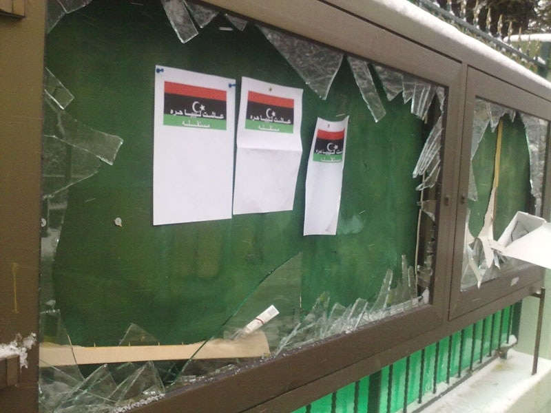 Razbijena stakla na tabli ambasade Libije prilikom protesta u Beogradu 22. februara 2011. Foto: Ognjen Zorić