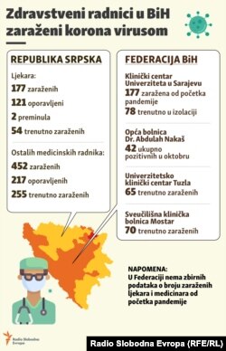 Tačan broj umrlih ljekara i medicinskih radnika tokom pandemije COVID-19 u BiH nije poznat. Grupa građana koja je podnijela krivičnu prijavu protiv nadležnih zbog nenabavke vakcina u prijavi navodi imena 25 ljekara koji su umrli od posljedica ove bolesti.