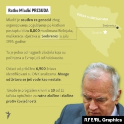 Ratni komandant Vojske Republike Srpske (VRS) Ratko Mladić je 22. novembra 2017. godine osuđen na doživotnu kaznu zatvora zbog genocida, zločina protiv čovječnosti, kršenja zakona ili običaja ratovanja.