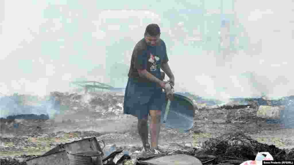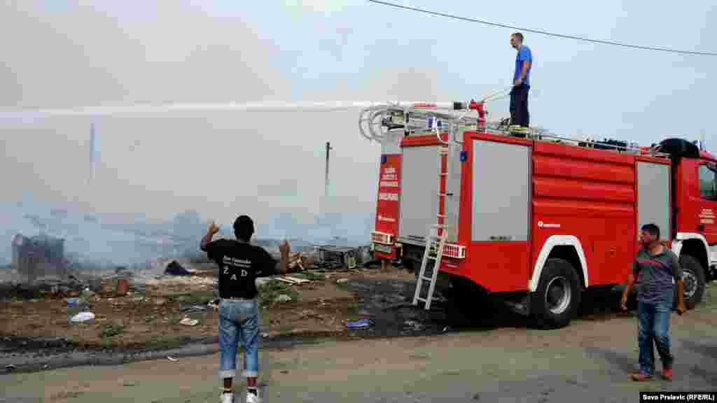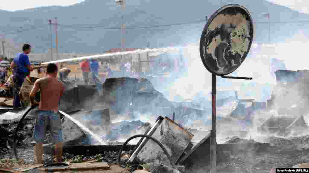 U izbjegličkom kampu u podgoričkom naselju Konik izbio je veliki požar, u kome je izgorio veliki broj baraka namijenjenih za izbjeglice sa Kosova. Foto: RSE / Savo Prelević, 24. juli 2012.