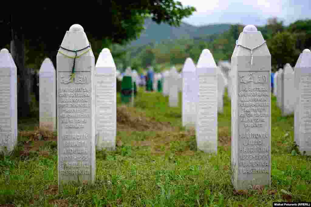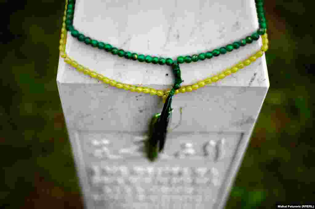 Dan nakon obilježavanja 19. godišnjice genocida nad Bošnjacima u Srebrenici, povremeni cvrkut ptica naruši tišinu u Potočarima gdje pažnju privlače nišani na kojima su ostavljeni tespihi korišteni tokom molitve svih ovih godina. Od 8.372 imena, uklesanih na spomen-ploču na mezarju u Potočarima, ostalo je još oko hiljadu duša koje čekaju na konačan smiraj. RSE/Foto: Midhat Poturović