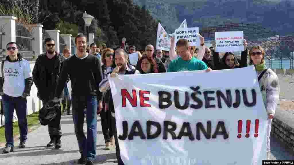 Paralelno sa početkom Jadranskog samita o nafti i gasu u Budvi i koji ima za cilj da ispita aktuelne mogućnosti i izazove u oblasti eksploatacije nafte i gasa, održan je protest koji je organizovaoGreen Home u saradnji sa hrvatskom koalicijom SOS za Jadran. 10.5.2015. RSE foto /Savo Prelević
