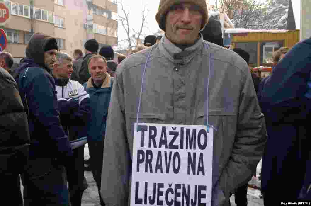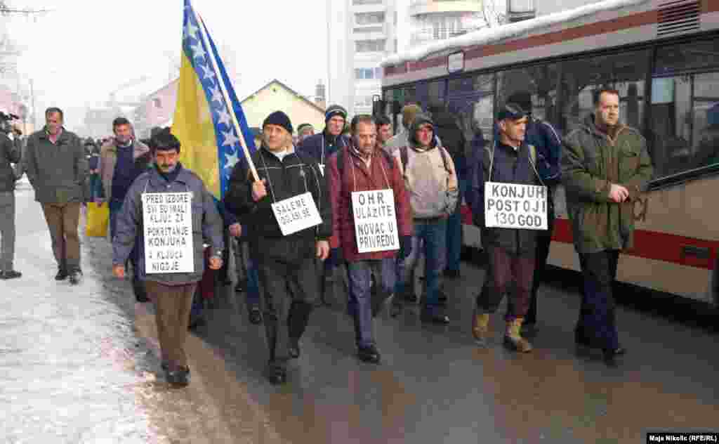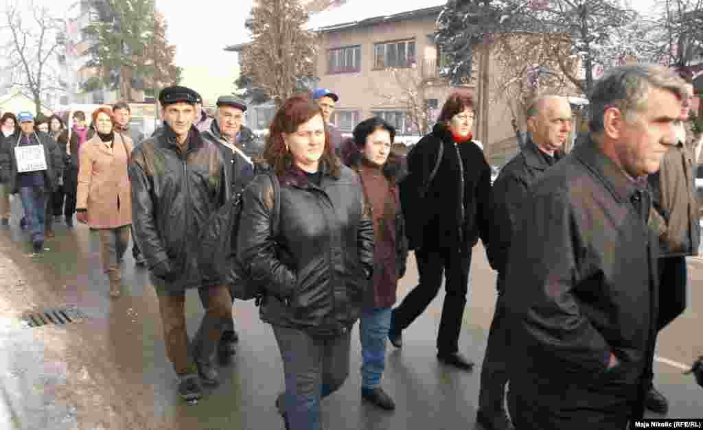 Oko 200 radnika tvornice namještaja Konjuh iz Živinica krenuli su u znak prosvjeda zbog narušenih radničkih prava pješice u Sarajevo pred zgradu OHR-a. Foto: Maja Nikolić, 28. januar 2013.