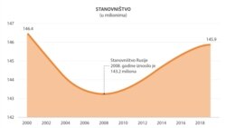 Kada je Putin preuzeo dužnost pre dve decenije, Rusija je tada gubila svake godine pola miliona stanovnika. Pad je započeo nakon raspada Sovjetskog Saveza, kada je Rusija imala 148,6 miliona građana. Najniži nivo je dostignut 2008. godine – samo 143,2, odnosno 5,4 miliona manje nego 2000.