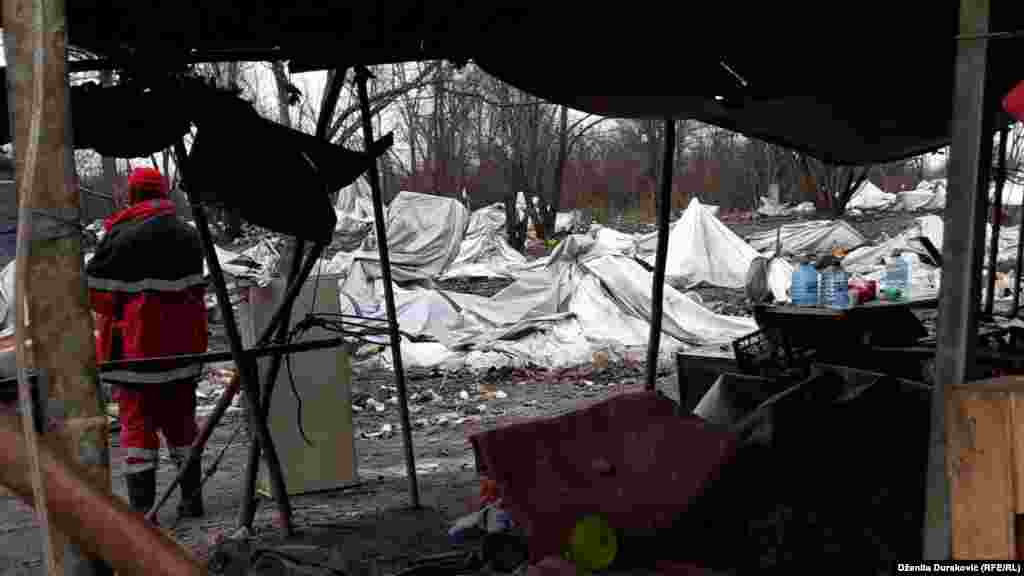 Volonteri gradskog i kantonalnog Crvenog krsta/križa iz Bihaća, od ranih jutarnjih sati 11. decembra raščišćavaju kamp Vučjak nadomak Bihaća u kome su do sinoć bili smješteni migranti. Sklanjaju šatore i drugu opremu, kako bi kamp u potpunosti bio očišćen.