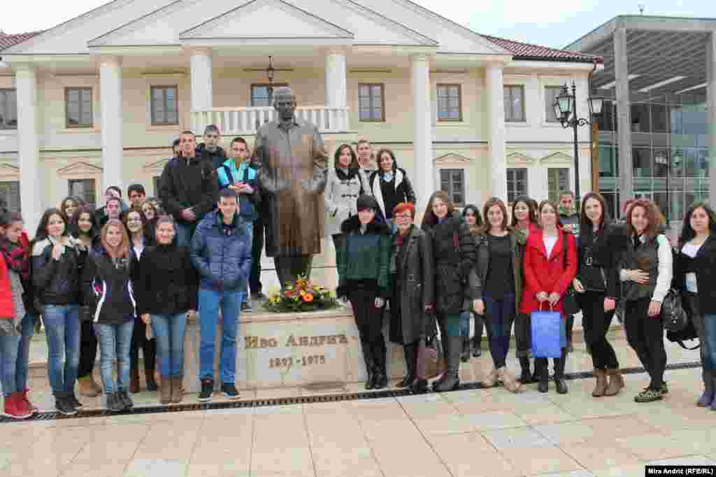 Povodom 40. godina od smrti nobelovca Ive Andrića u Višegradu je održano književno veče - Andriću u čast. Istim povodom, višegradski srednjoškolci su položili cvijeće pred njegov spomenik u Andrićgradu. Višegrad, mart 2015. RSE foto