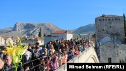 Učenici nekoliko osnovnih škola u istočnom dijelu Mostara su bacili ljiljane u Neretvu, u čast Mostu i svim poginulima, a skok bez aplauza izveo je skakač Ermin Sarić.