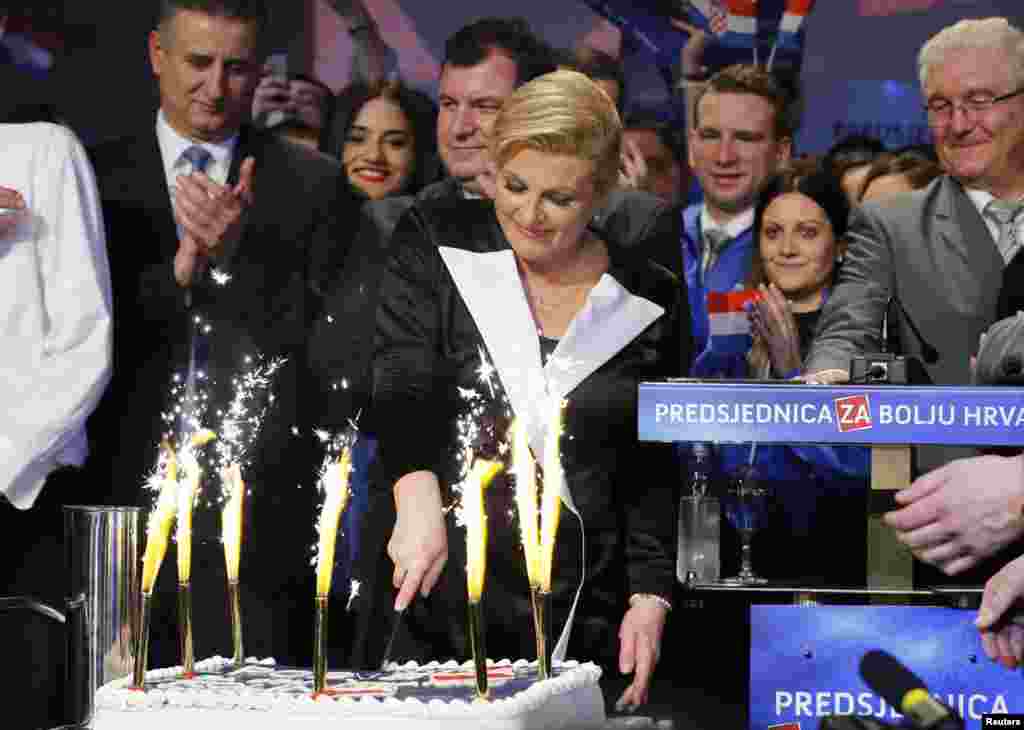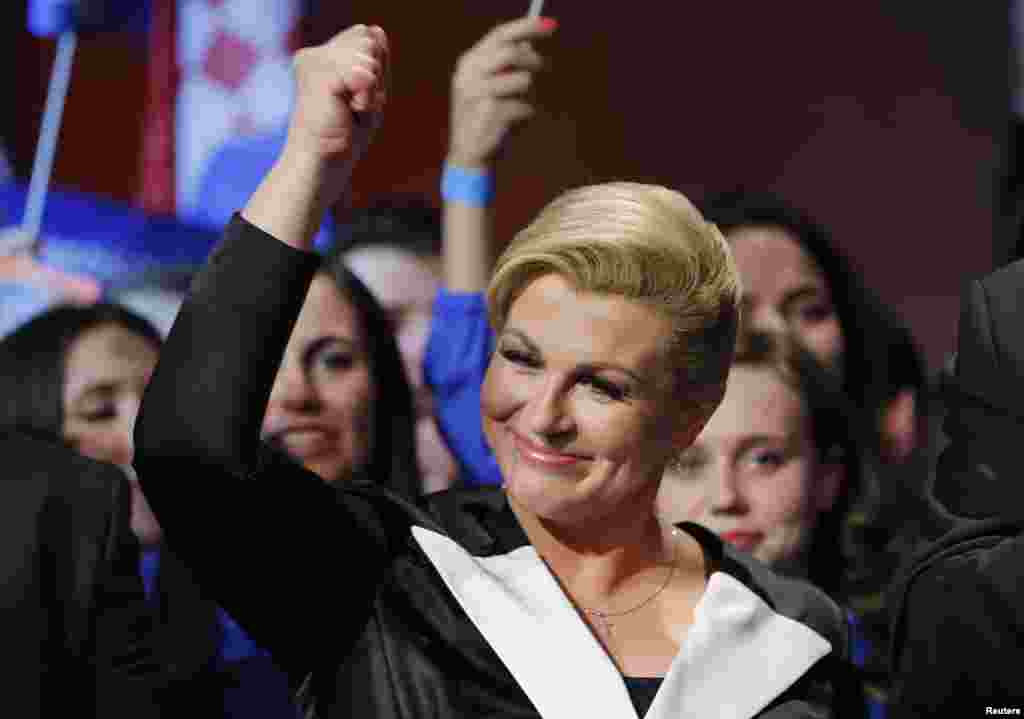 Croatia, Kolinda Grabar-Kitarovic of the opposition HDZ celebrates her victory in Croatia's presidential run-off election on the stage at her campaign headquarters in Zagreb January 11, 2015