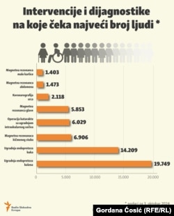 Najveći broj njih, skoro 20.000, čeka na ugradnju proteze kolena, a potom na ugradnju kuka oko 14.000 pacijenata.