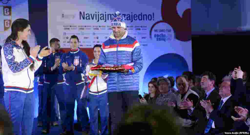 U Beogradu je predstavljena reprezentacija Srbije koja će učestvovati na Zimskim Olimpijskim igrama u Sočiju. Na svečanoj ceremoniji Igara državnu zastavu nosit će Milanko Petrović, bijatlonac. Foto: RSE / Vesna Anđić, 3. februar 2014.