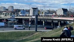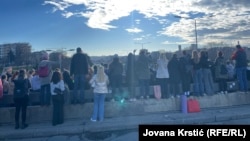 Pred kraj blokade studenti stoje uz ogradu nadvožnjaka i aplauzom pozdravljaju automobile koji prolaze autoputem i trube u znak podrške.