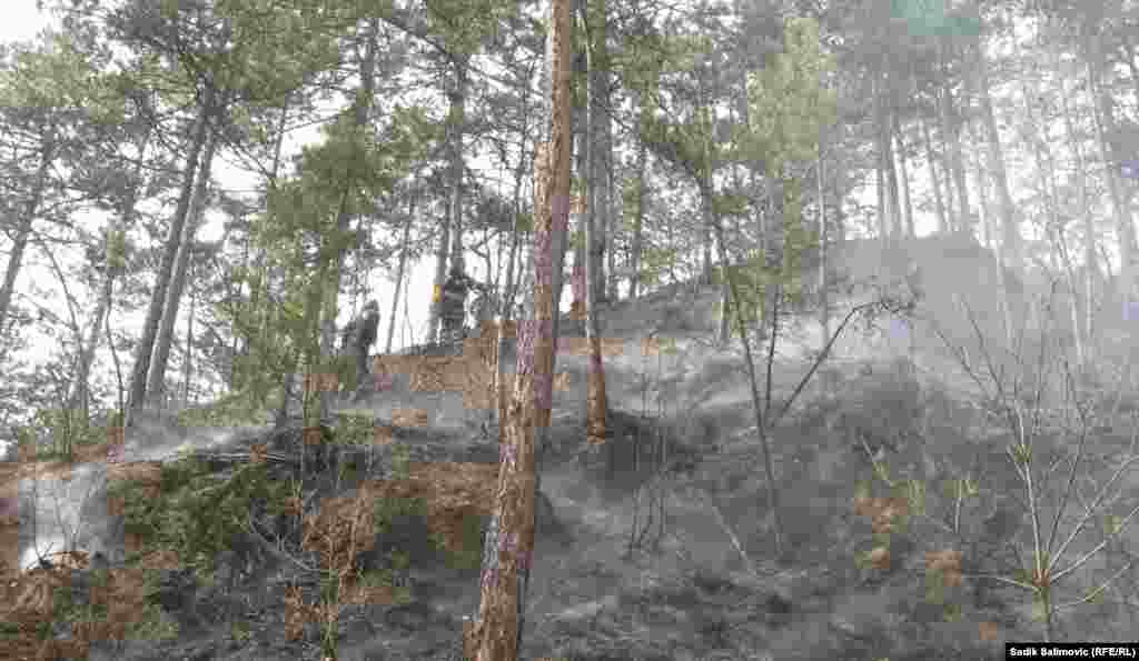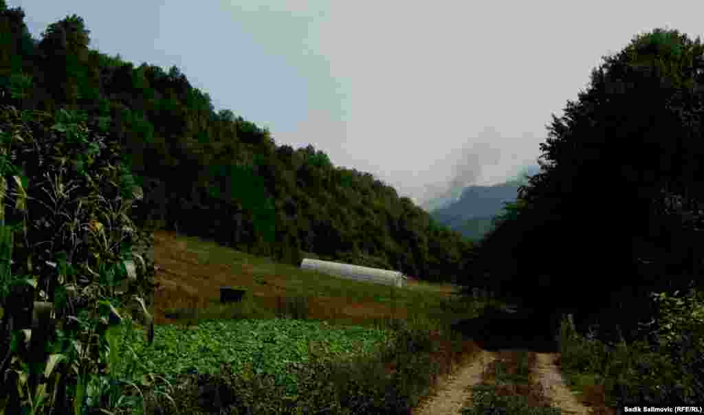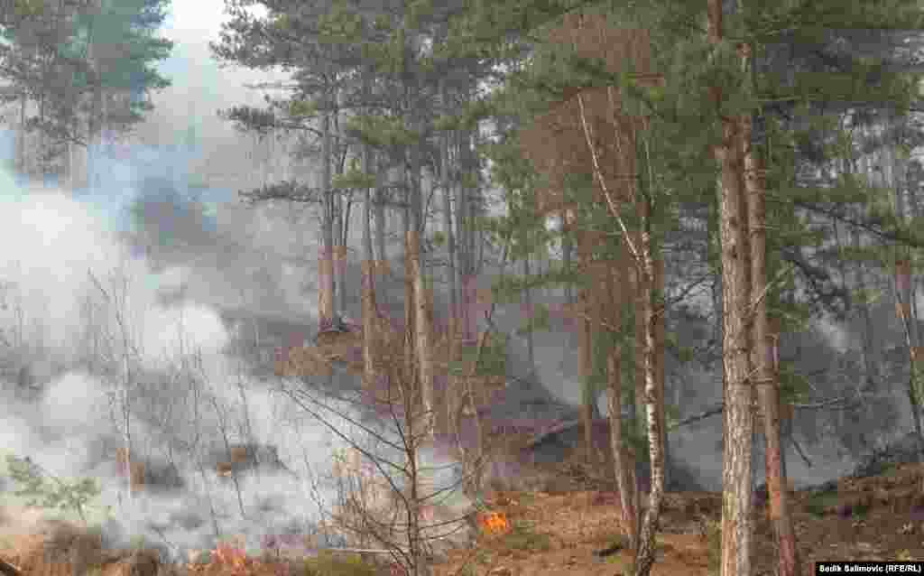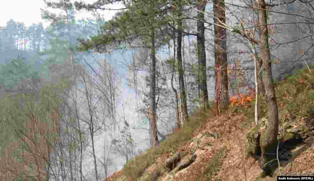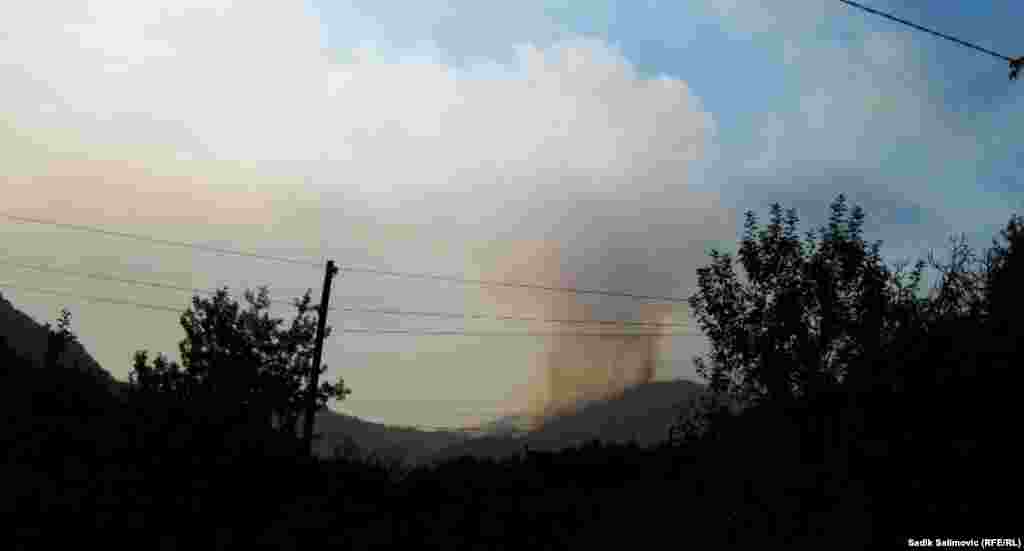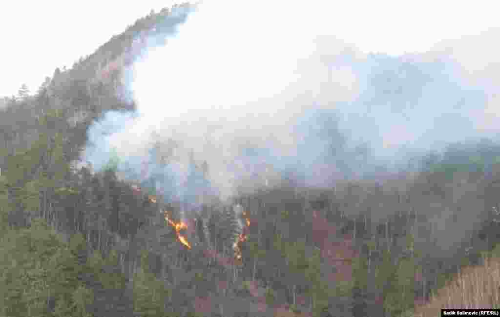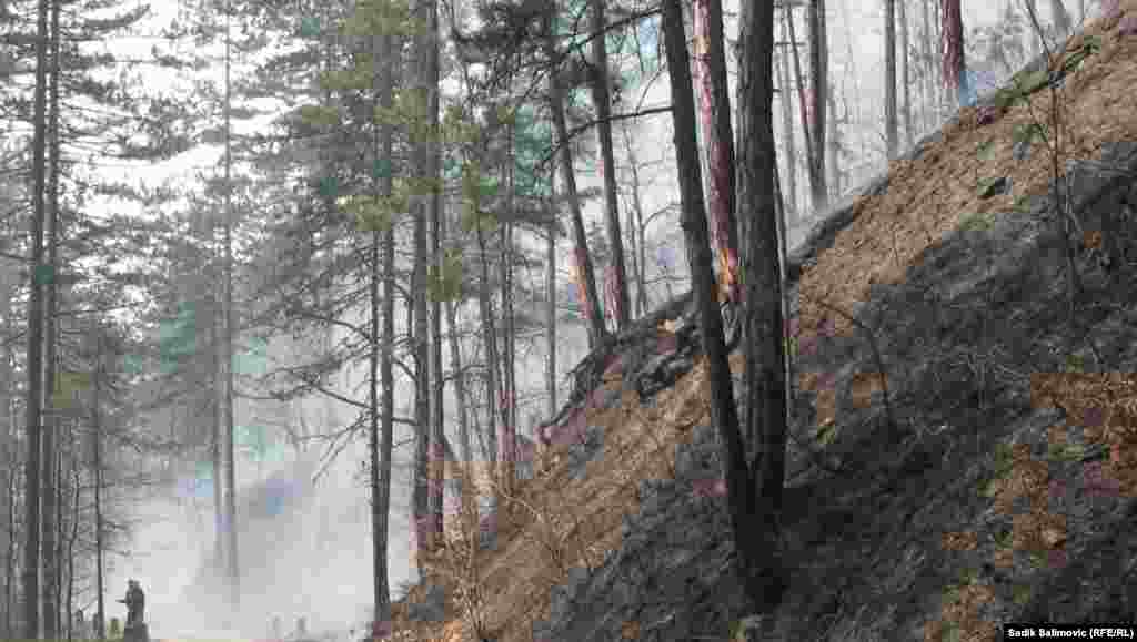 Vatra koja je zahvatila šume oko Srebrenice i Bratunca i dalje je aktivna. U nekoliko opština proglašeno je vanredno stanje zbog ugroženosti kuća. Foto: RSE / Sadik Salimović, 22. august 2012.
