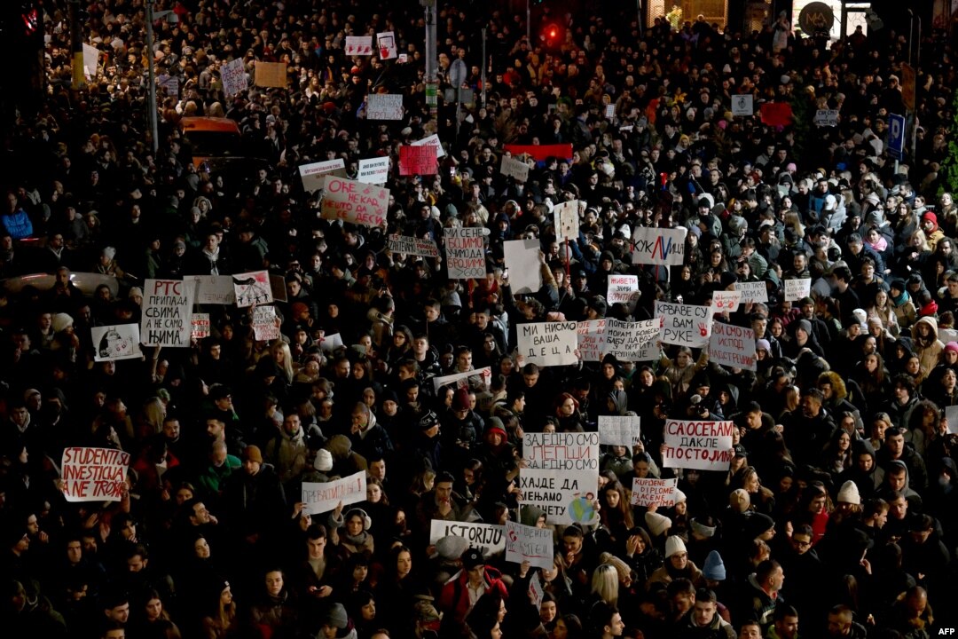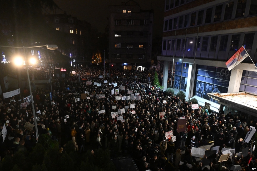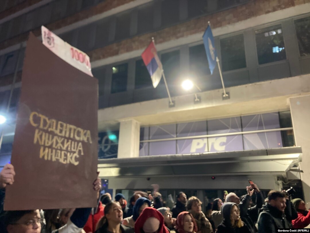 Kako su javili novinari Radija Slobodna Evropa, pred zgradom RTS-a u kojoj je studio iz kog se emituje centralna informativna emisija Dnevnik, okupilo se više hiljada studenata koji su uzvikivali "Pustite nas uživo".